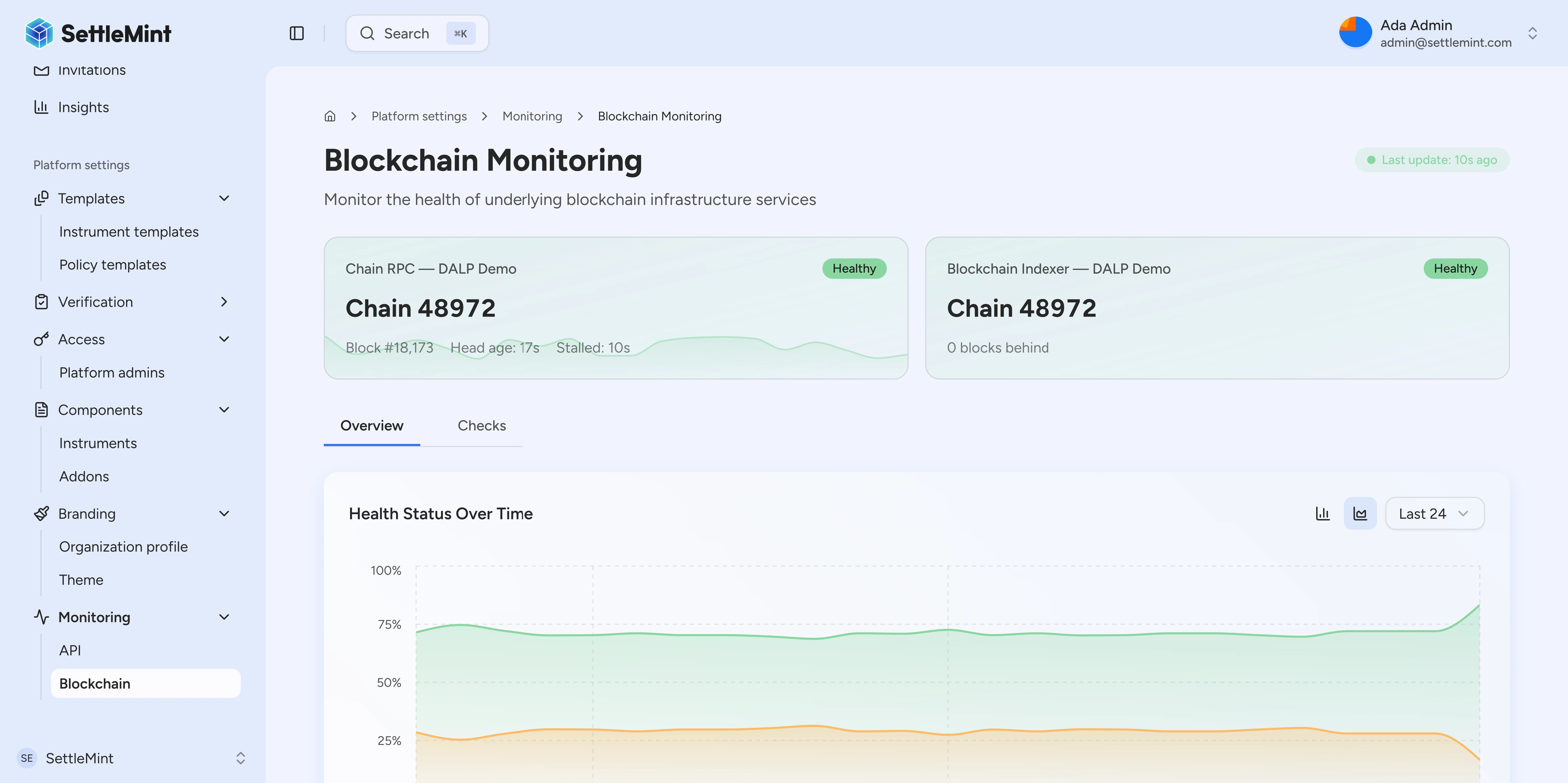 | Chain metrics | Block lag, gas prices, confirmations | Blockchain health |