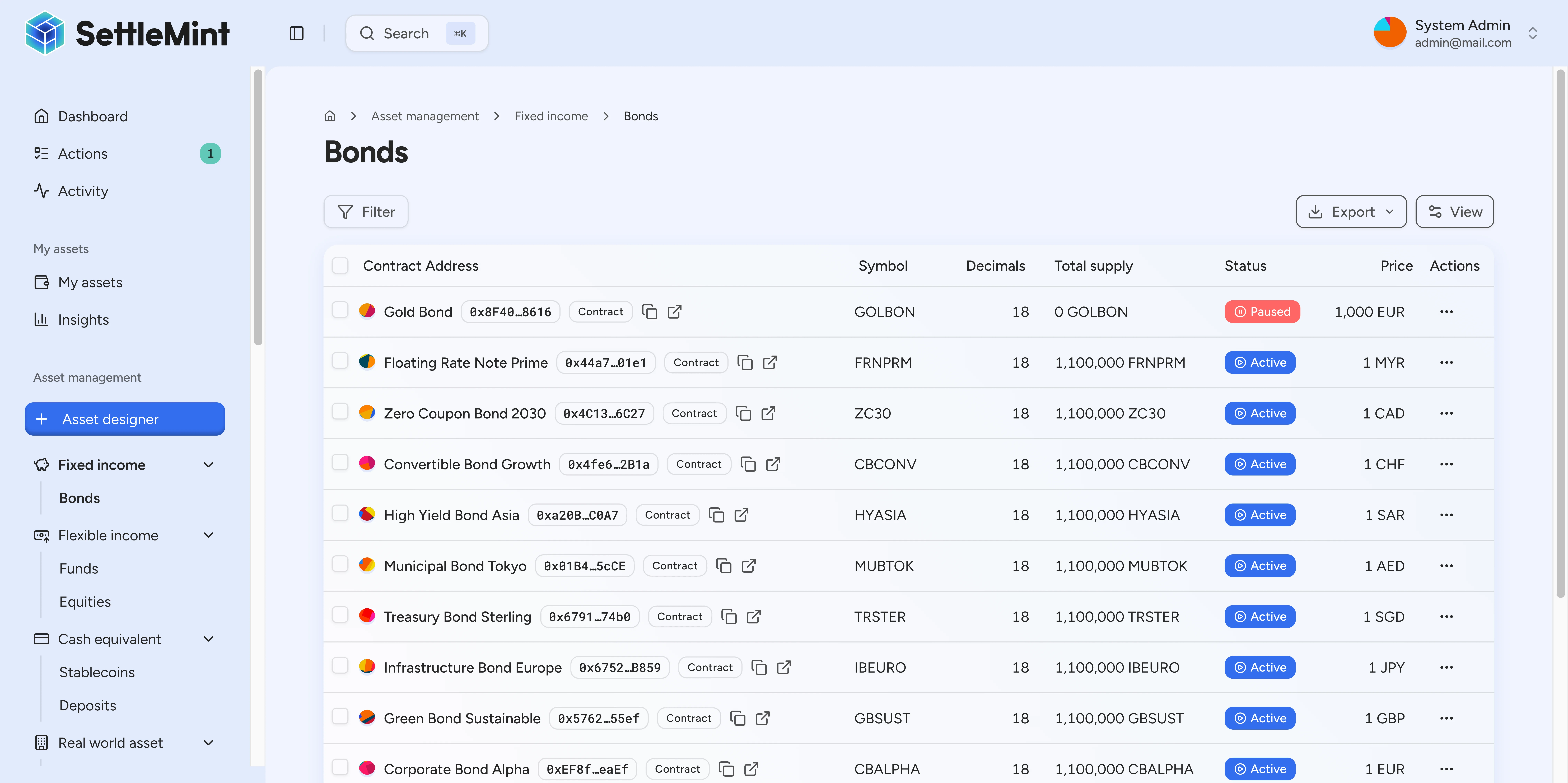 Each asset type implements the SMART Protocol (SettleMint Adaptable Regulated Token), which means they all share compliance infrastructure, custody controls, and operational tooling despite having different economic terms and lifecycle events.