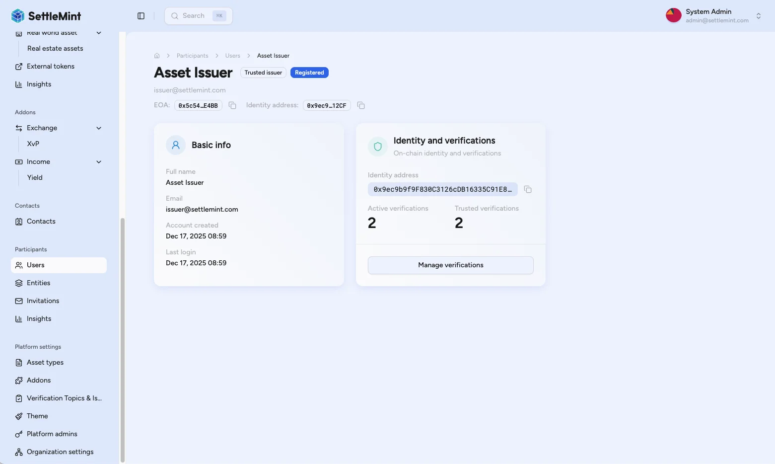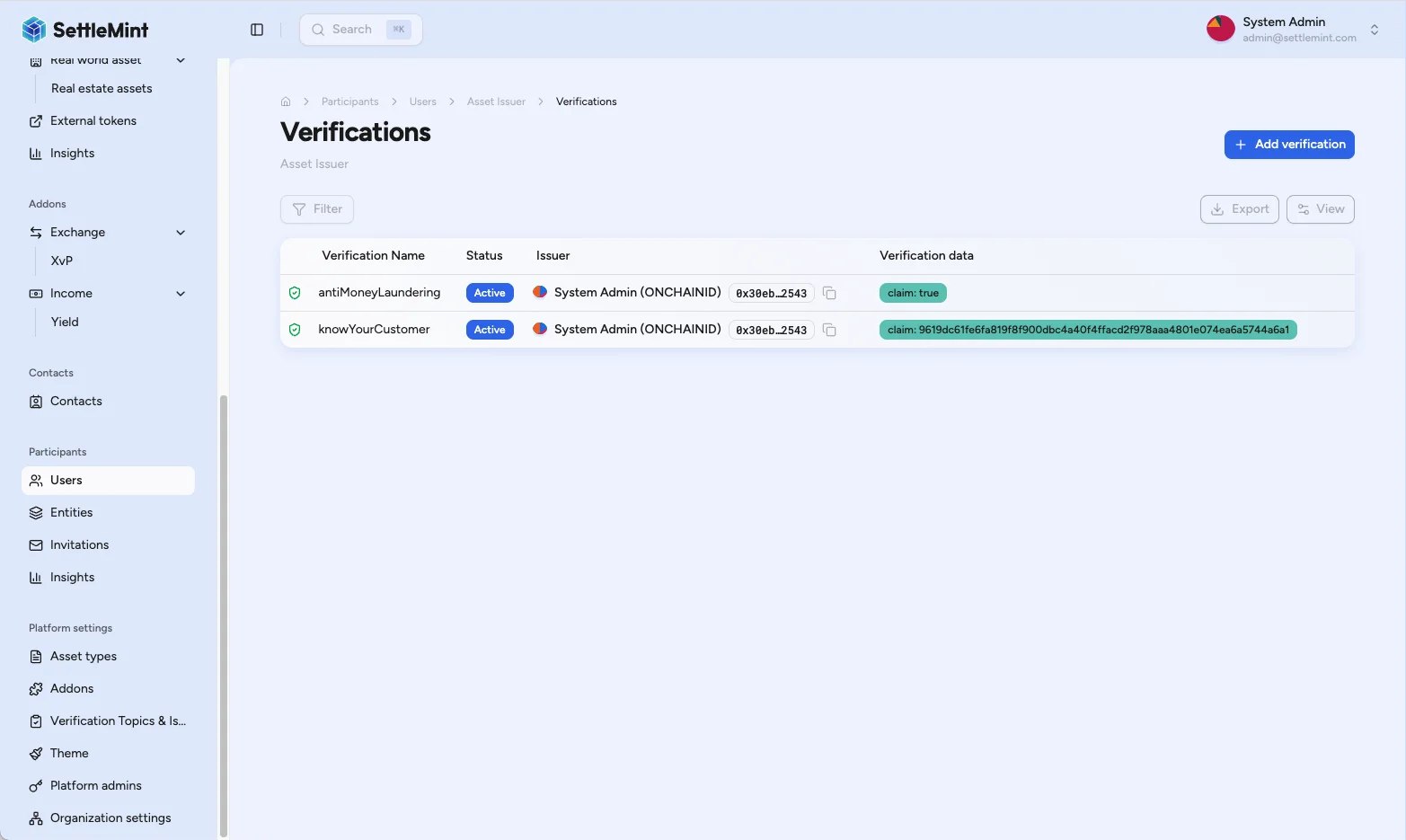 | Cannot see Add verification button | • Verify you have Verification Issuer role • Check you're configured as trusted issuer for KYC topics • Ensure user is enrolled in registry |