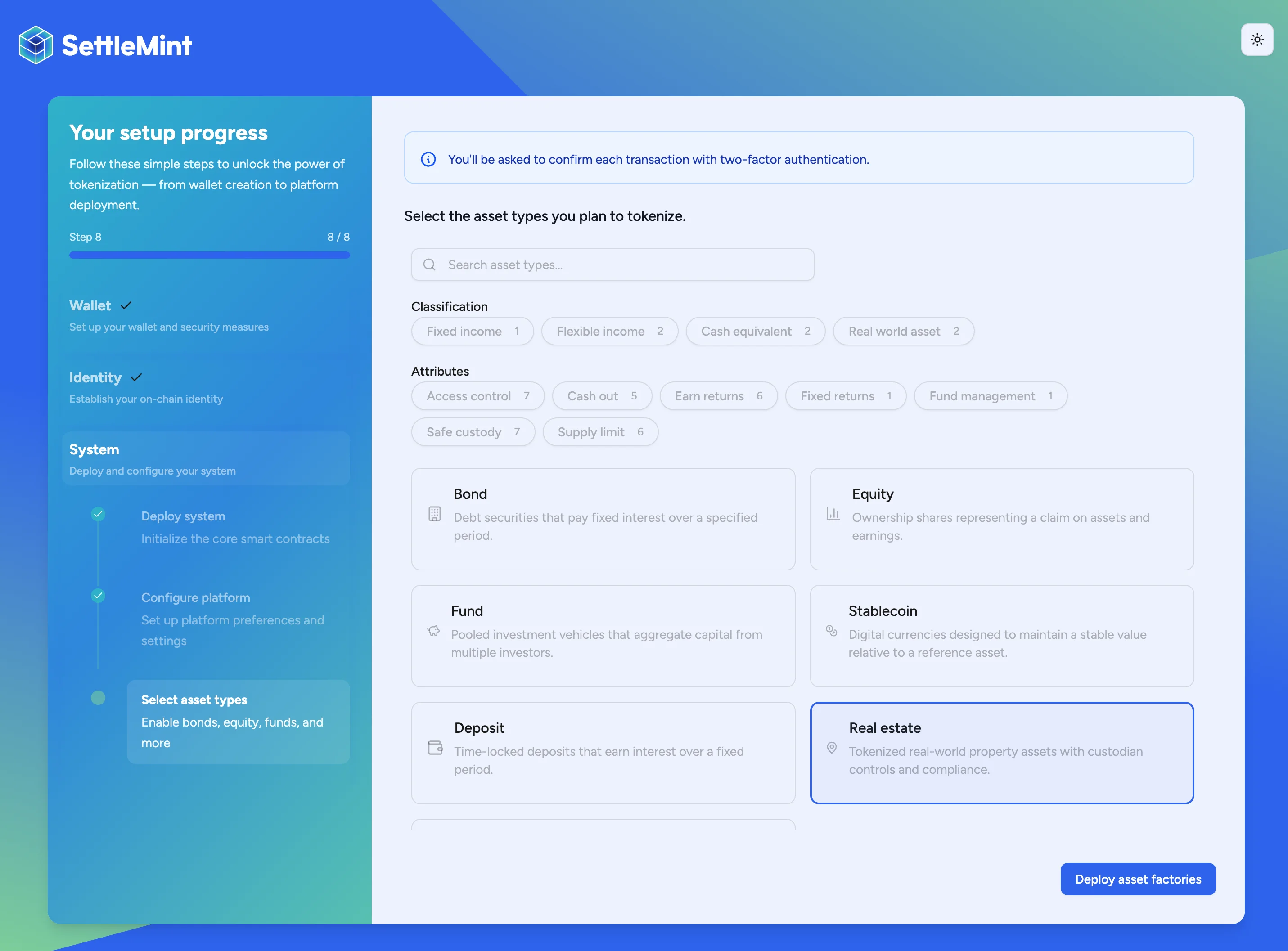 Select which asset types your platform will support by checking the relevant boxes: Equity, Bond, Fund, Stablecoin, Deposit, and/or Real Estate. Click Enable asset types and enter your PIN.