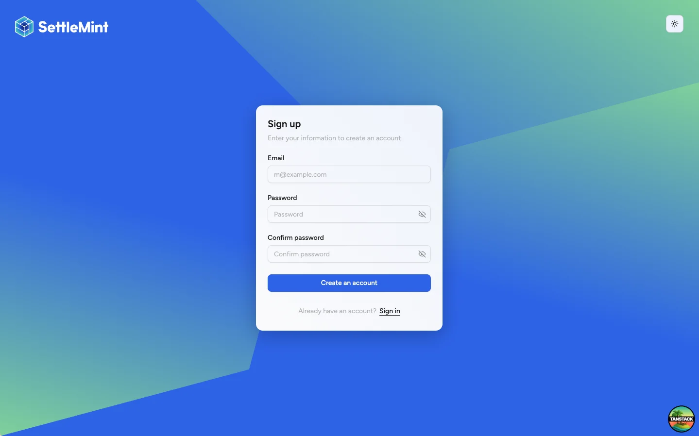 Navigate to your platform and click Sign up. Enter your email address and choose a strong password, then click Create account.