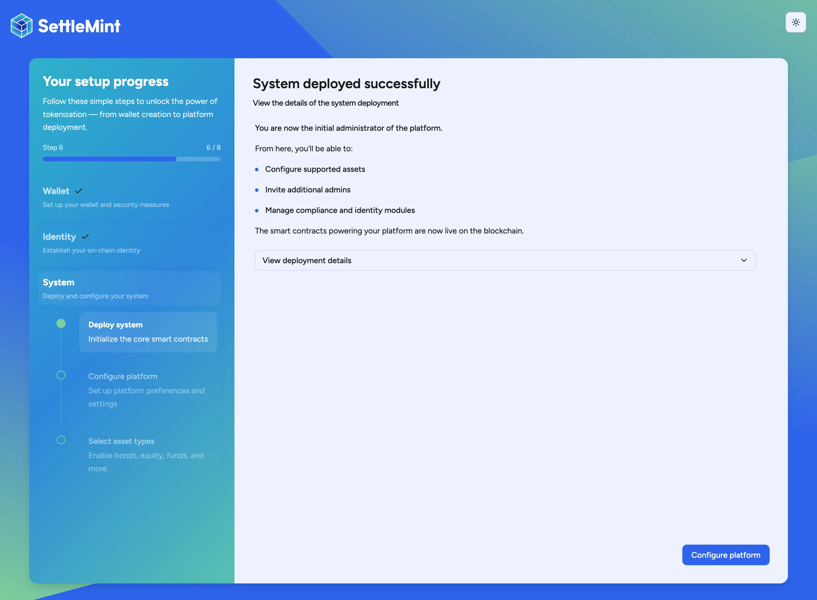 Only the first user can initialize the system. This sets up all core platform infrastructure including identity management, access control, and compliance capabilities.