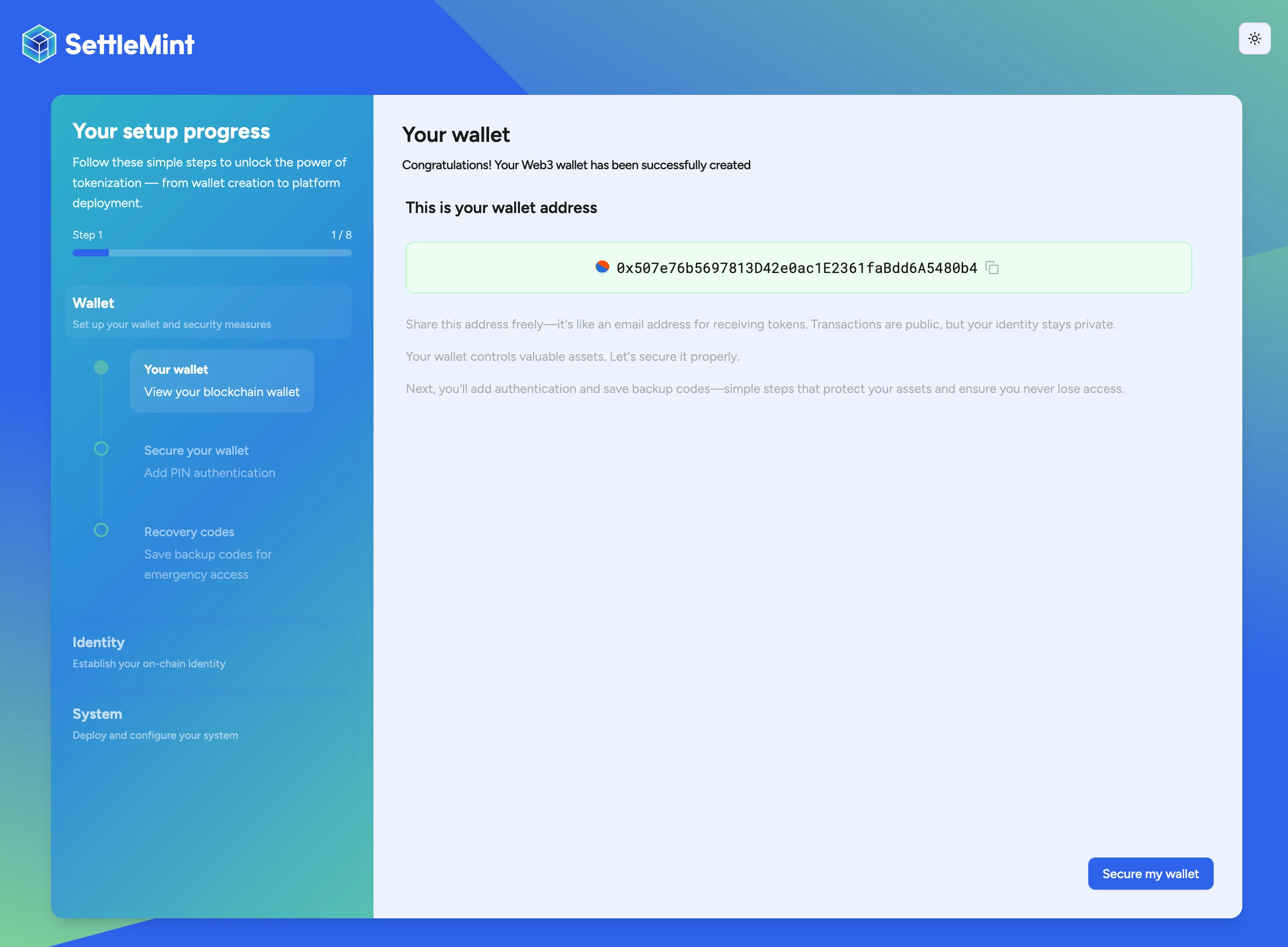 Click Create my wallet to generate a new externally owned account (EOA). The system generates a unique wallet address and creates secure key storage. Take note of your wallet address for future reference.